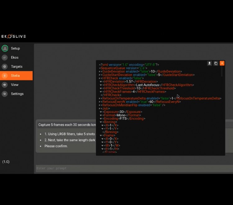 A significant advancement in EkosLive is the integration of Stella, an AI-powered assistant designed to streamline and automate various aspects of observatory control. Stella is capable of interpreting natural language commands, allowing users to schedule observations, initiate capture sequences, and adjust equipment settings through simple text inputs.