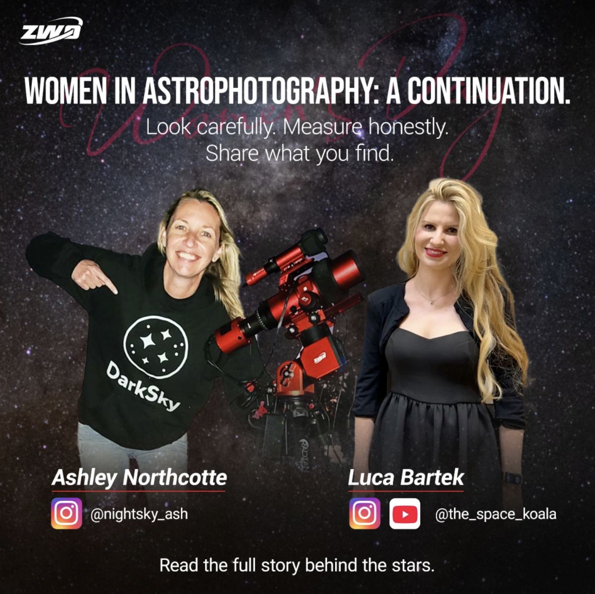 ![]() Joined 6/24/2024 Loc: Mo, USA | Posted 3/8/2026 8:18:35 AM CST I recently had the opportunity to sit down with two trailblazing women in astrophotography and learn a little more about what makes them tick. The conversations were relaxed, insightful, and genuinely fun. It felt less like an interview and more like the kind of discussion you have with fellow astrophotographers after a long night under the stars. I spoke with Luca Bartek (The Space Koala) and Ashley Northcotte (AstroBackyard), two people who came into the hobby from very different paths but ended up sharing the same passion for capturing the night sky. Luca’s journey began with simple curiosity and a telescope. Like many of us, she quickly discovered that imaging could reveal far more than visual observing alone. Living under heavy city light pollution eventually pushed her to seek darker skies, which now means traveling into the Swiss mountains to capture deep sky objects with patience and a very methodical imaging workflow. Ashley Northcotte came into astrophotography through the Astrobackyard community. Over time she developed her own role in the field, combining astrophotography with dark sky advocacy. With a background in environmental science and education, she is deeply involved in helping people understand the importance of protecting our night skies and why light pollution matters. What I appreciated most about these conversations is that they were not really about labels. We talked about the same things astrophotographers everywhere talk about. Gear choices. Processing challenges. Light pollution. Travel for dark skies. The small victories that come from finally capturing a faint target after hours of work. In other words, the same things that keep all of us looking up. You can read the full story here: