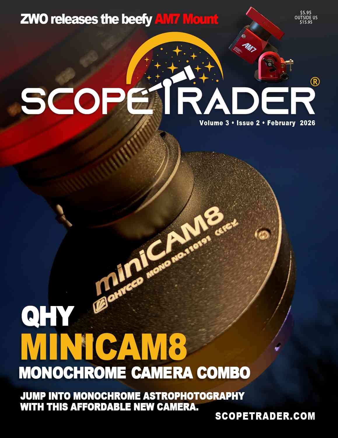 ScopeTrader February 2026This issue is a good snapshot of where amateur astronomy is headed right now. The equipment is getting smarter, the software is getting more helpful, and the gap between beginner friendly and observatory capable is shrinking fast. Whether you are just stepping into astrophotography or you have been doing this for decades, there is something encouraging about the range of tools now available.Our featured story is the miniCAM8 M camera deep sky combo review. The idea that a monochrome imaging bundle can be packaged in an affordable, complete way says a lot about the moment we are in. Monochrome imaging used to feel like a complicated leap. Now it is becoming an option that more people can realistically explore, with everything needed to get started in one place. On the mounts side, the release of the AM7 from ZWO is another sign that manufacturers are listening closely to what astrophotographers want. Reliable performance, less setup friction, and serious capability without requiring an observatory budget. We also look at the rise of automatic polar alignment, which is quickly moving from a luxury feature into something that feels genuinely practical for everyday imaging. For those who enjoy keeping up with the bigger landscape, we cover the MLAstro SAL 66, a beefy observatory class mount announcement that shows where high end engineering is going. Software continues to push the hobby forward as well. OpenAstro AlpacaBridge launches with real implications for device connectivity, AstroFiler 1.2 brings calibration automation updates, and LuckyStackWorker 7 makes planet and moon stacking easier for anyone working with high frame rate imaging. We also take a look at the Texas Star Party 2026, one of the most anticipated gatherings under dark skies. Rounding out the issue are practical discussions on FITS astrophotography files, the re-launch of the Vaonis Hyperi smart telescope with its eye catching price tag, and a new light pollution filter, the LEVIATHAN Spectral Pro. It is a full issue, and it reflects a hobby that is growing in both accessibility and ambition. Get more issues of ScopeTrader