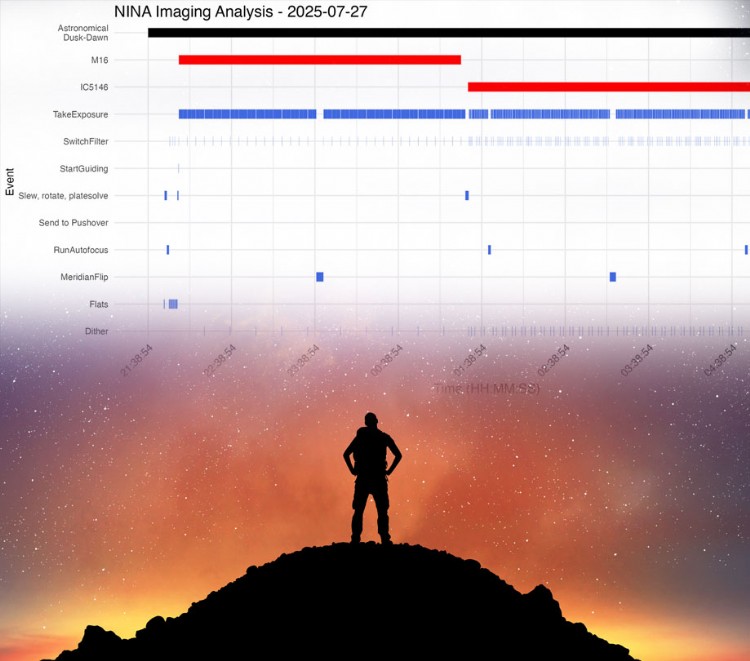 This timeline allows astrophotographers to immediately identify downtime, inefficiencies, and recurring issues. Events such as exposures, target acquisition, meridian flips, autofocus runs, and filter changes are visually separated so users can get a quick overview of how their system performed.