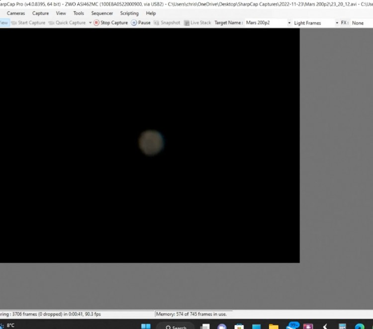 Chris explains that Mars rotates at a pace similar to Earth, with a day only slightly shorter than ours. This means there's a practical time window of a few minutes for capturing before rotational blur becomes a problem. His goal is to acquire several thousand frames in this window. The more frames available, the more data there is to select and stack the sharpest ones, which will ultimately yield a clearer final image. Even if only the top 25 percent of frames are used, having a large pool to draw from significantly improves image quality.