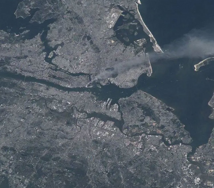 In the above photo, visible from space, a smoke plume rises from the Manhattan area after two planes crashed into the towers of the World Trade Center. This photo was taken of metropolitan New York City (and other parts of New York as well as New Jersey) the morning of September 11, 2001.