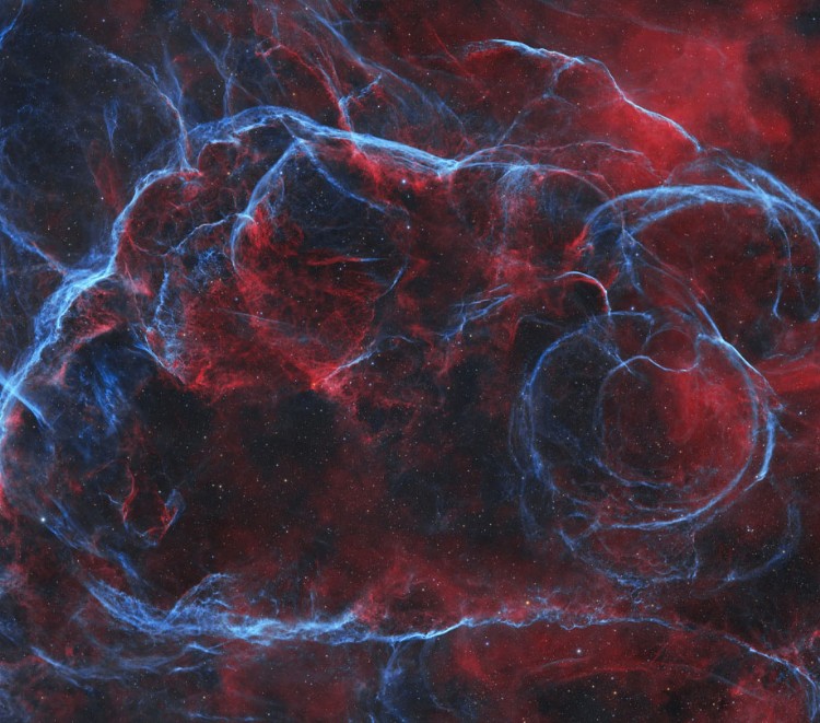 "This breathtaking image, captured under a challenging Bortle 6 sky, masterfully showcases a vast supernova remnant with remarkable clarity and depth. Using an impressive 36 hours and 50 minutes of integration, the photographer blends scientific precision with artistic flair, employing an HOO palette and 2x Drizzle Integration to enhance resolution and bring out intricate filamentary details. The processing highlights the vibrant red hydrogen filaments against ethereal blue oxygen wisps, with RGB stars seamlessly blended for a natural starfield. This stunning composition reveals a cosmic tapestry of chaos and rebirth, making it both a technically outstanding and emotionally evocative astrophotography."